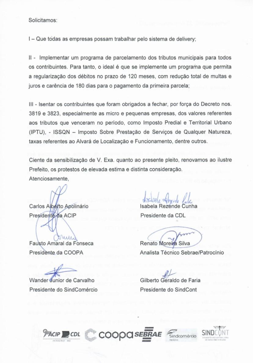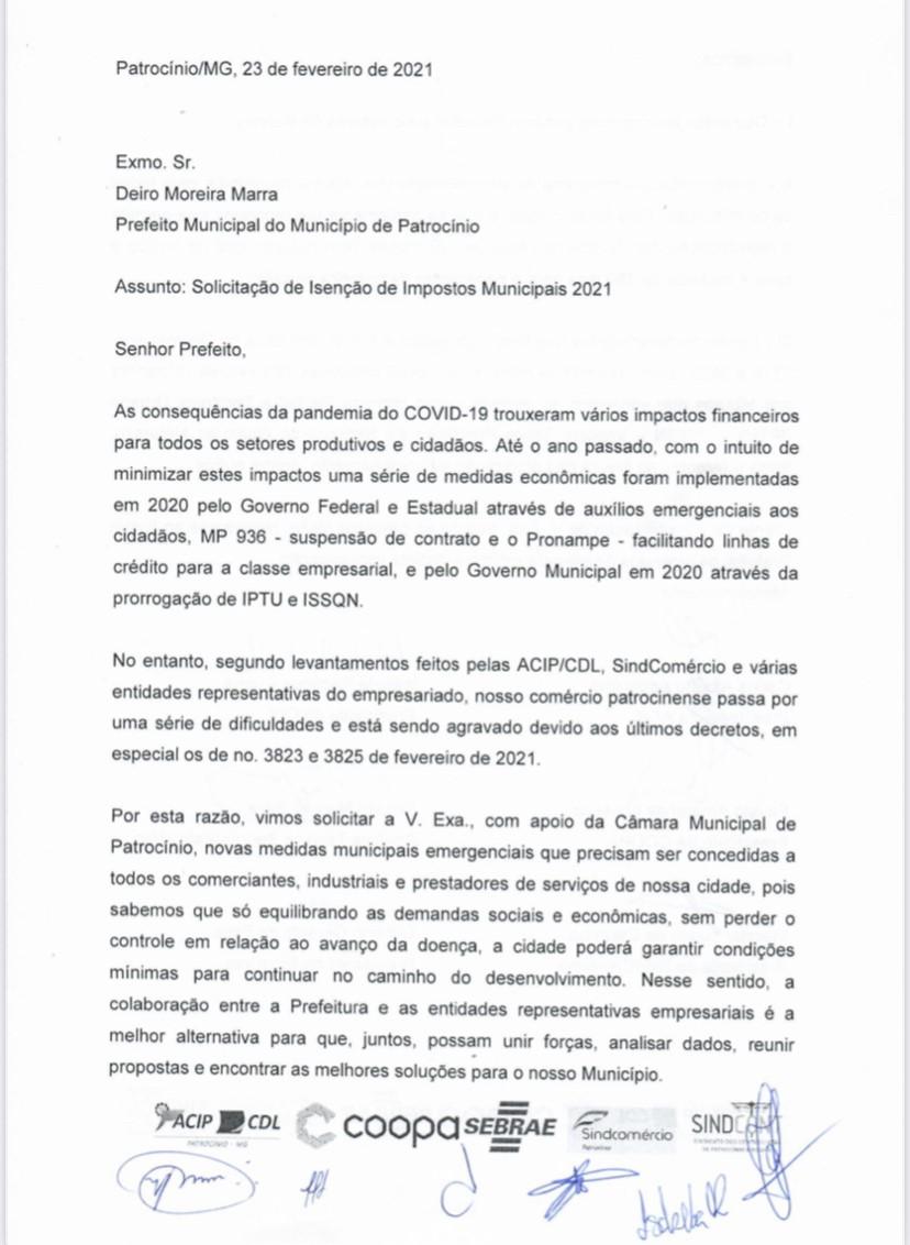 Diante das inúmeras dificuldades enfrentadas pelos comerciantes em Patrocínio frente aos últimos decretos municipais, as ACIP/CDL, COOPA, Sindcomércio e o Sindicato dos Contabilistas entregaram durante encontro com o Prefeito Deiró Marra, um ofício solicitando a isenção do Imposto Predial e Territorial Urbano (IPTU), do Imposto Sobre a Prestação de Serviços de Qualquer Natureza (IPSSQN), das taxas referentes ao Alvará de Localização e Funcionamento, dentre outros. Nada mais justo, pois os mesmos já estão há mais de 10 dias impedidos de abrirem seu comércio.