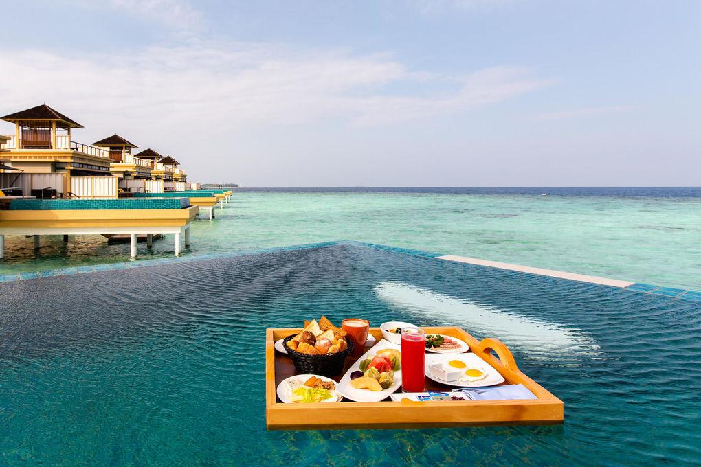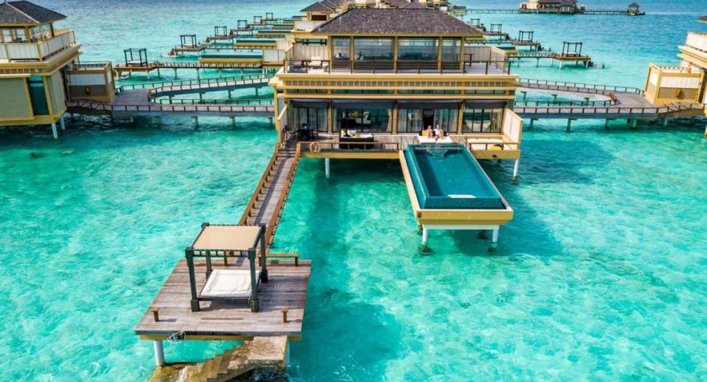 Localizado a 20 minutos do aeroporto de Male, o resort oferece café da manhã, possui 7 restaurantes e bares, oferece atividades como: mergulho autônomo, mergulho com snorkel e jet ski (pago a parte). Para você se hospedar nesse hotel em um charmoso bangalô sob a água com piscina privativa, você vai precisar desembolsar somente 4479,00 euros, módicos R$27.729,00. Acrescentando o valor do aéreo do casal, o pacote sai por R$38.829,00.