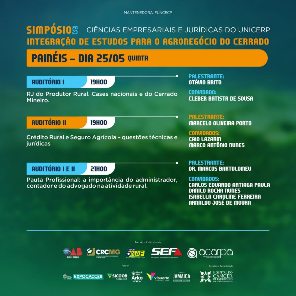 O Unicerp realizará nos dias 24 e 25 de maio, mais uma edição do Simpósio de Ciências Empresariais e Jurídicas. Em novo formato, o evento é uma oportunidade única de reunir em um só lugar grandes profissionais e estudantes das áreas de Direito, Agronomia, Contabilidade e Administração, pois irá proporcionar oportunidades para novos estudos, troca de informações, atualização de conhecimentos e networking com outros profissionais da área.