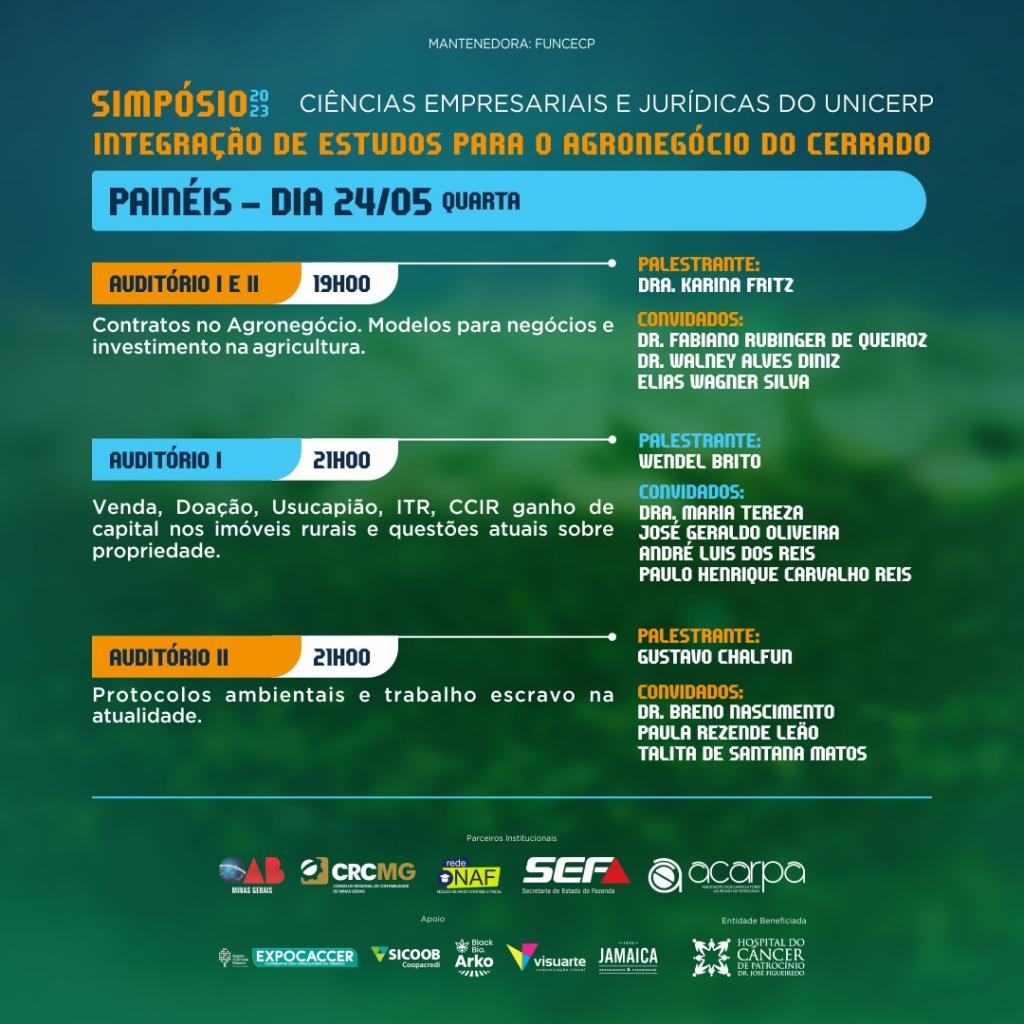 Dentre os palestrantes confirmados estão profissionais de renome nas áreas como a Secretária Geral da Associação Luso-Alemã de Juristas, Dra. Karina Fritz; o agrônomo e Consultor de Agronegócios do Banco do Brasil, Marcelo Oliveira Porto; o Desembargador do TJMG, Dr, Fabiano Rubinger de Queiroz; o auditor da Receita Federal, André Luiz Reis; a juíza Dra. Maria Tereza Horbatiuk Hypolito, o agente de operações de crédito rural, Marco Antônio Nunes de Melo; dentre outros.