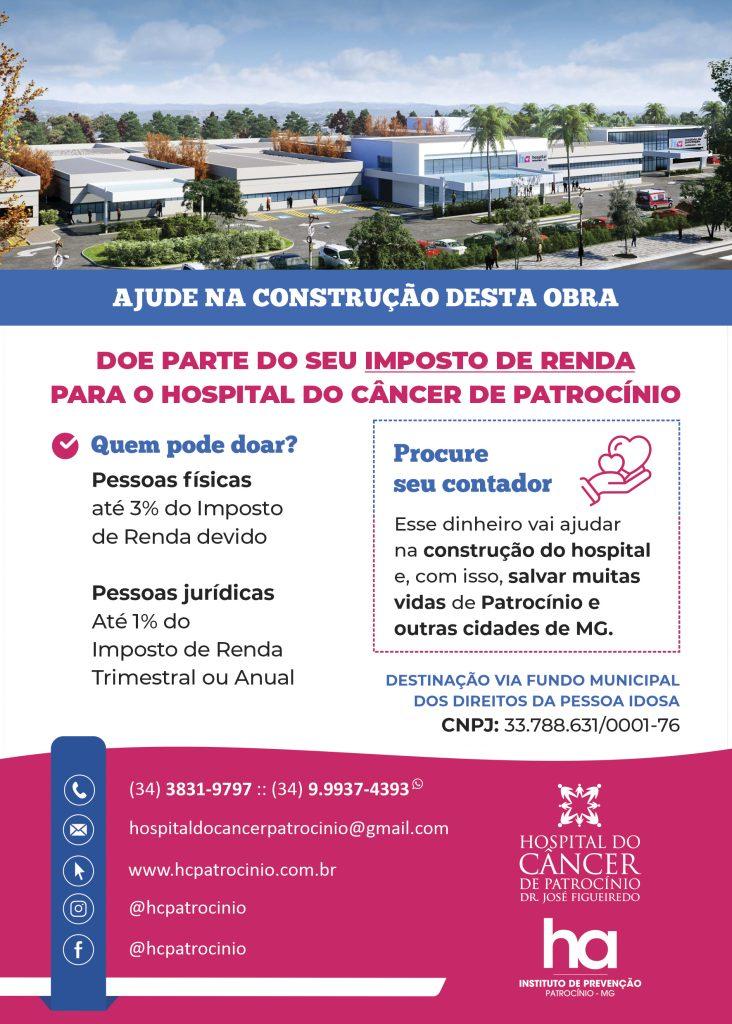 Lembre-se que você pode destinar parte do seu Imposto de Renda para as obras do Hospital do Câncer de Patrocínio. É fácil e sem custos.
