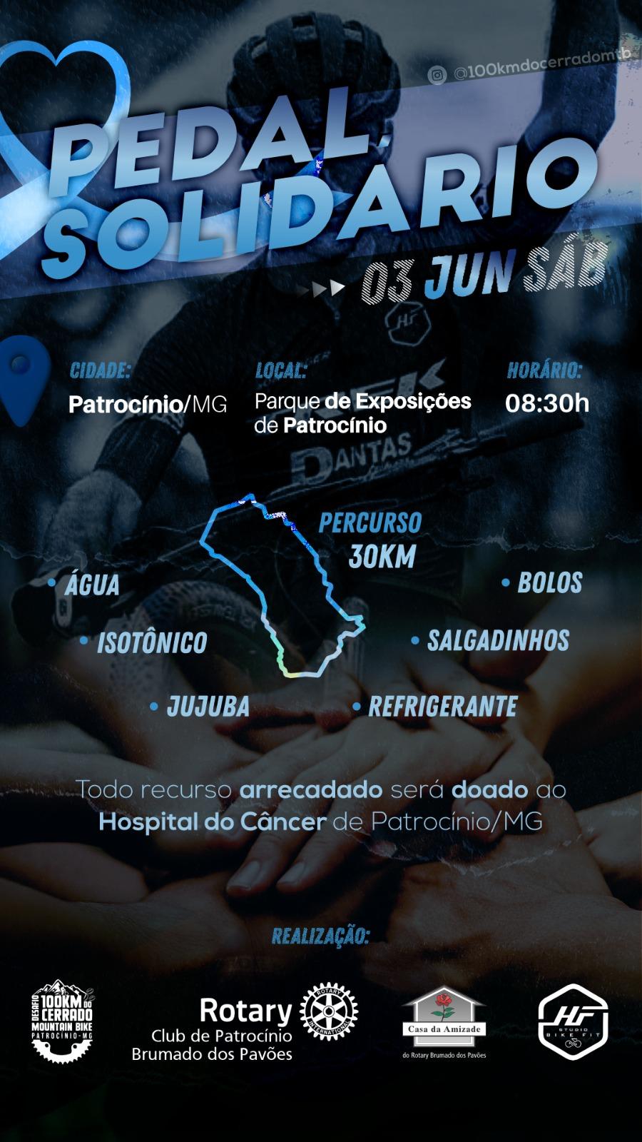 No dia 03 acontece, em Patrocínio, o Desafio Mountain Bike 100km do Cerrado e o Pedal Solidário. A promoção é do ciclista profissional, Halyssom Ferreira, que realiza no município o evento que arrasta ciclistas de várias partes de Minas Gerais e de outros estados do país. Para essa segunda edição, o idealizador do evento, firmou parceria com o Rotary Club de Patrocínio Brumado dos Pavões.